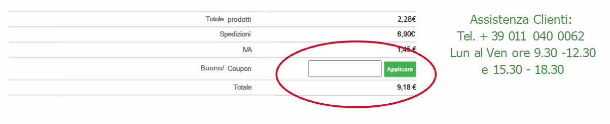 - Inserisci il tuo buono regalo nell’apposita casella “Buoni / Coupon” e clicca su Applica.
