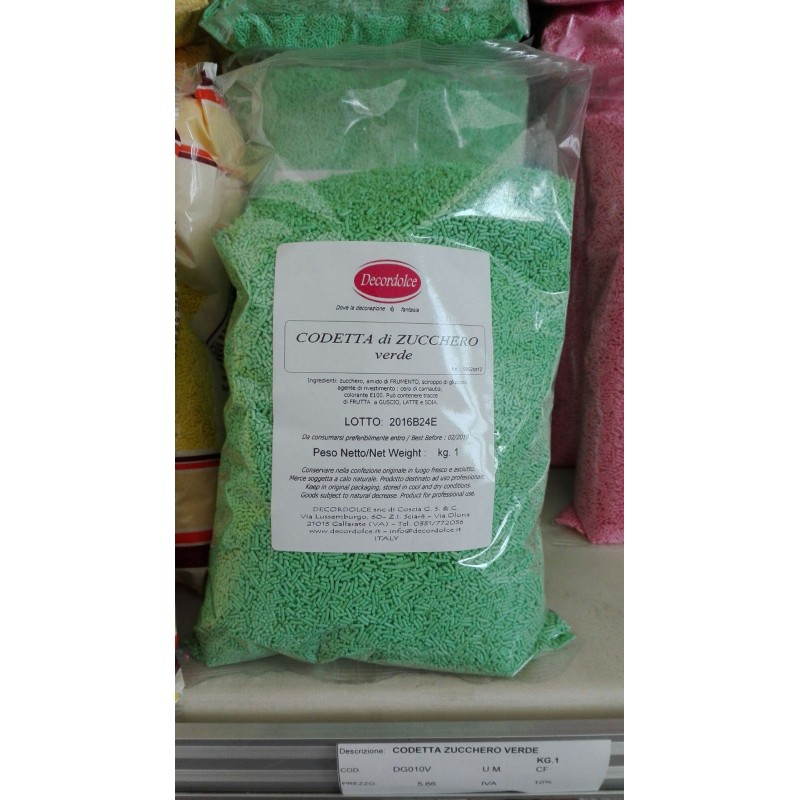 La codetta di zucchero è prodotta dal taglio in "cilindretti o scaglie" dello zucchero con l'aggiunta di coloranti alimentari ( rosso, verde, giallo, blu, rosa, celeste etc.)
